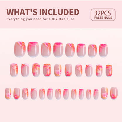 Each set includes 32 pieces in 15 different nail sizes for a custom fit . along with nail glue. adhesive tabs. a double-sided file. a cuticle stick—everything you need for easy application anytime. anywhere!